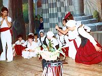 No se si fue ese día, hubo una representación en el teatro de la Residencia, que recuerdo como muy variada y pintoresca. Uno, creo que un tal Valentín, hacía un playback de Rod Stewart. Dos chicos, uno rubio y otro moreno, esta vez a pelo, cantaron una canción de los Pecos. El grupo de danzas A, ataviados con los típicos trajes blancos de gerriko rojo, bailaron música popular vasca. Acompañándolos, para hacer bulto a los lados y bailar un poquillo, estábamos los del grupo de danzas B, con chicos reclutados “a la fuerza” por Gloria. Yo era uno de ellos y estaba contento, porque por lo menos de entre los malos era de los buenos. Me pusieron en primera fila. Mi hermano logró escaquearse.