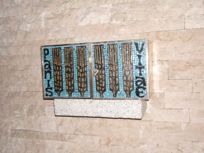 Foto nº 77: Interior de la capilla. Detalle de sagrario, realizado en metal y mosaico de pedrería. "PANIS VITAE", palabras de Jesucristo extraidas del Evangelio según San Juan: "Ego sum Panis Vitae" ("Yo soy el Pan de Vida") (Juan, 6:48). (Cortesía del webmaster). |