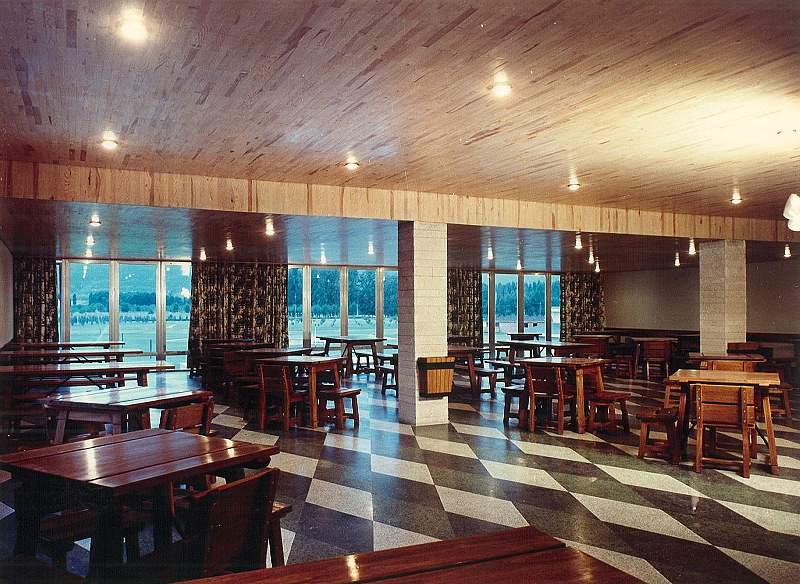 Foto nº 23: Vista del salón de la zona noble, o Sala del Consejo, a la que se accedía desde una puerta camuflada en la pared de madera al lado del "office" que había junto al "interfono", en la primera planta, sobre la zona de cocinas. En él había también un dormitorio y aseos, y era utilizado por directivos de la Caja de Ahorros cuando venían de visita. Nunca nos dejaban entrar a esa zona: yo mismo la he podido ver por vez primera a través de ésta foto. Nótese el estilo del mobiliario, muy del gusto de la época (principio de los 60). (Cortesía del webmaster). |