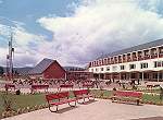 Foto nº 17: Fotografía del patio de recreo de niñas, tomada desde los jardines que le separaban del de niños. Se puede apreciar a cerca de un centenar de niñas haciendo ejercicios de gimnasia. En primer plano, los típicos bancos de listones rojos, que había no sólo aquí, sino también en la zona de piscinas. (Cortesía del webmaster). |