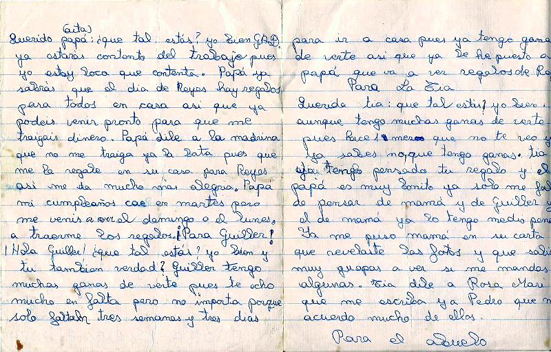 Noche de sueños donde el niño que llevo dentro, se confunde con la realidad. Donde lo negro es blanco y lo oscuro es claro, haciendo que la vida, nos abra con transparencia. Recordando, aquellos jugetes como la peonza, los coches y camiones, canicas y balones. Ahora en nuestras mentes, el tiempo se para, mientras avanza en realidad en otro sistema de diversion que, distinto apaga, el compañerismo participe que nos enriquecia, al jugar en los patios de la resi de Villarcayo. Por eso, mi carta seria la siguiente. Queridos reyes magos, de bueno es saber, que esta noche, tendres muchisimo trabajo, primero, en leer las cartas, para lugo repartir todos los jugetes a todos los niñ@s del mundo, como beberos las copas que os dejaremos para recuperar fuezas, despues de tanto ajetreo. Yó, no quiero nigún regalo para mí, pero a cambio me gustaria, que ayudes a Sor Teresa en Haiti, junto a los diferentes coperantes, a levantar dicho país. Tambien por los lugares que esten en guerra, por los pobres, etc... para que este año, nos sintamos más unidos, reflesivos y coherentes a la vez. Feliz noche de reyes a todos, esperando que no os traigan mucho carbón.
